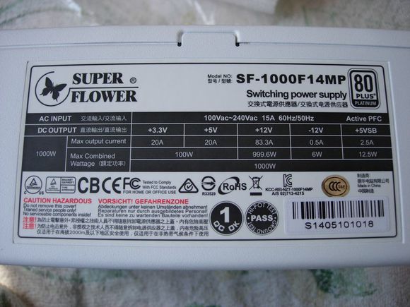 电源的侧面参数。我们可以看到+12V输出可以达到83.3A,额定功率可以达到999.6W。右上角也印有80PLUS白金认证标志。型号为SF-1000F14MP