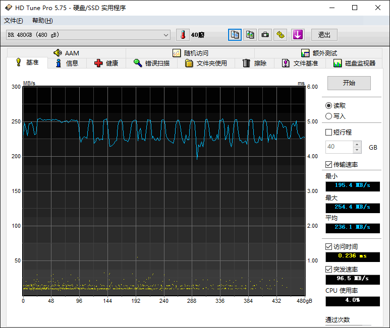 速度测试,在USB3.0硬盘盒模式下,最小195MB,最大254MB,平均读取速度236MB,读取曲线虽然不稳定,但至少跳动不大,颗观察出颗粒属于中规中矩,跟主控方案有关。